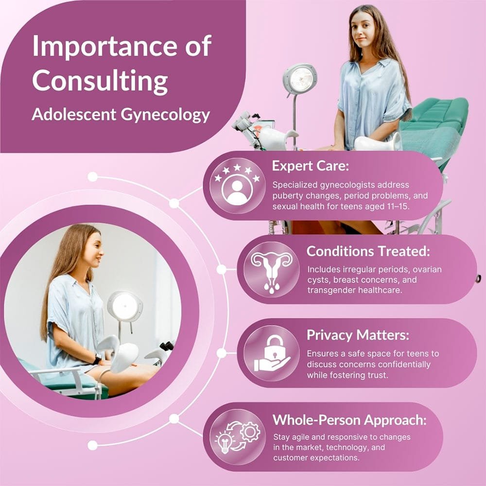 Adolescent gynecology addresses the unique medical and emotional needs that arise during puberty and early adulthood. It includes education, prevention, diagnosis, and treatment of common concerns, helping teenagers feel comfortable and knowledgeable about their changing bodies and health.